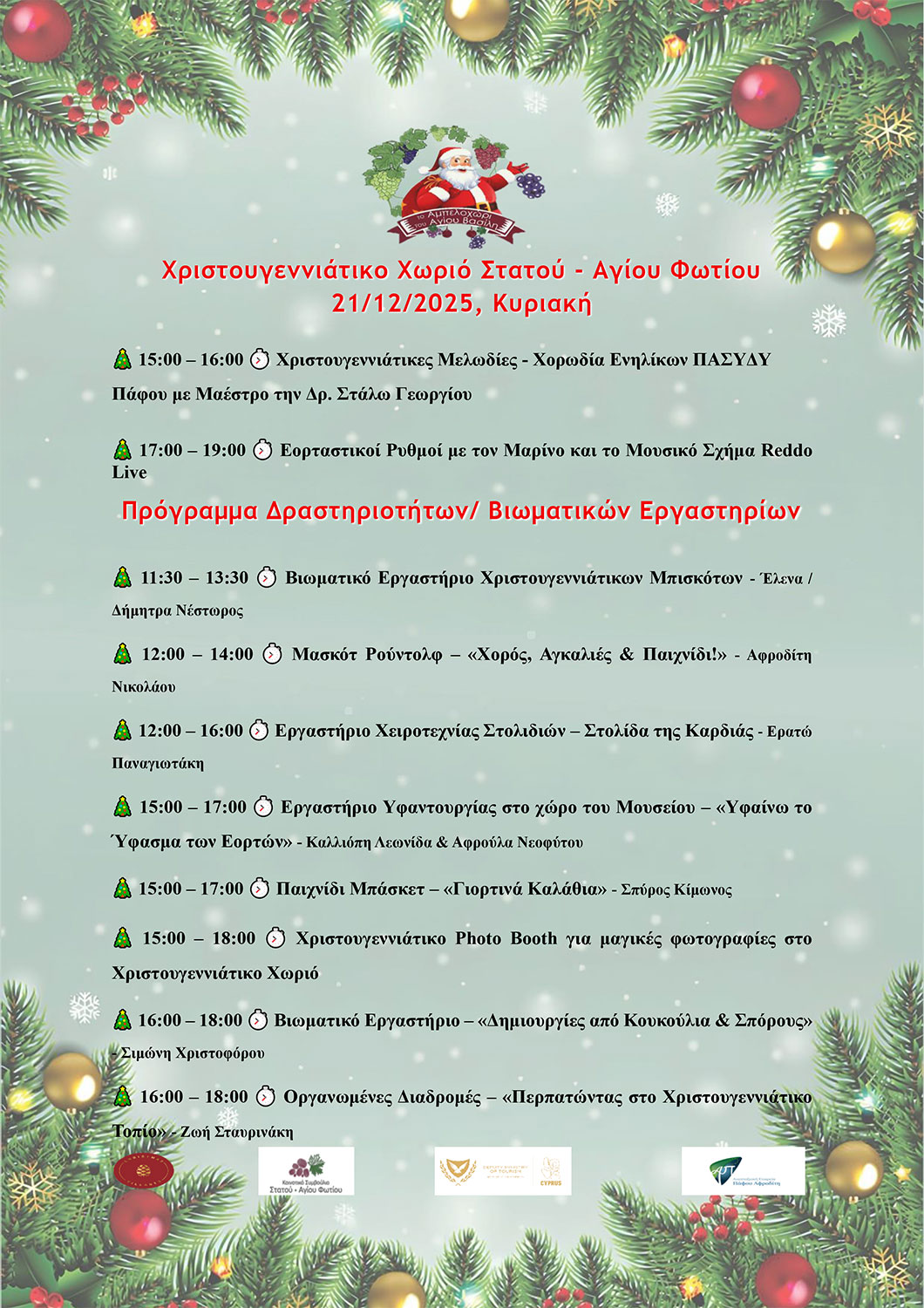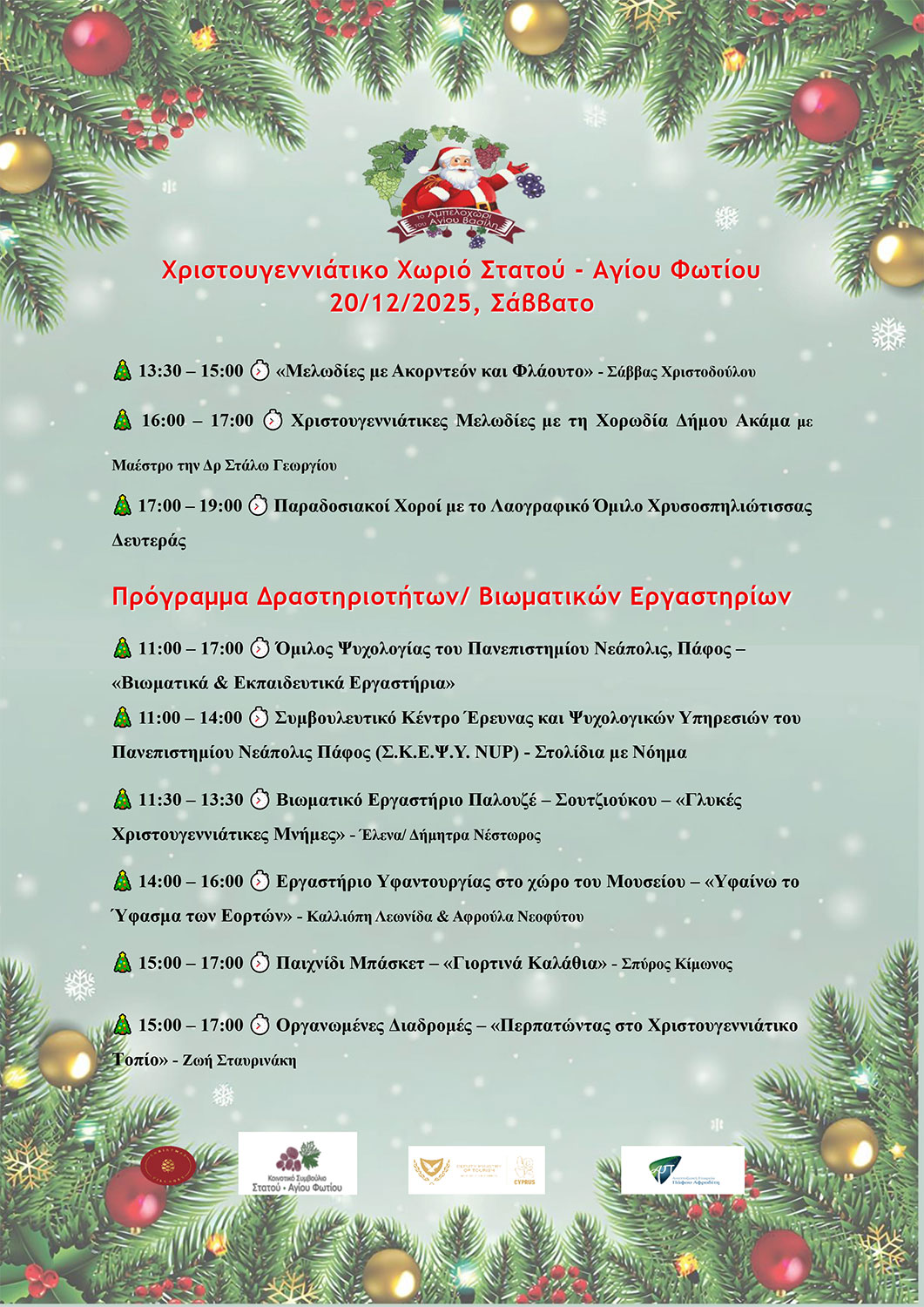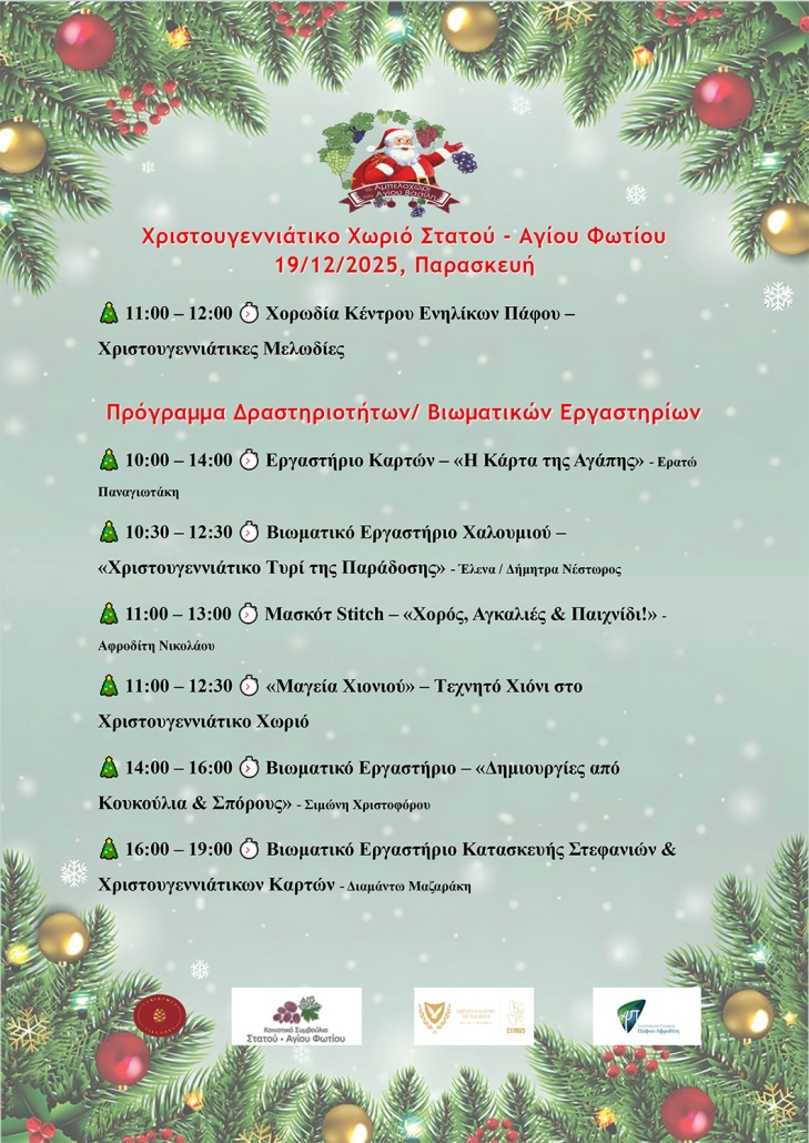 Είσαστε εδώ: Ανακοινώσεις/Εκδηλώσεις1 / Πρόγραμμα Χριστουγεννιάτικου Χωριού Στατού Αγίου Φωτίου 19-21/12/2025...